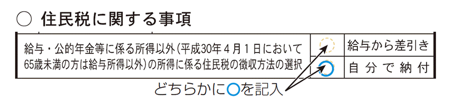 給与から差し引くことを希望する場合には、「給与から差引き」(特別徴収)のチェックボックスに丸を記入し、また、給与から差し引かないで別に窓口等に自分で納付することを希望する場合には、「自分で納付」(普通徴収)のチェックボックスに丸を記入します。